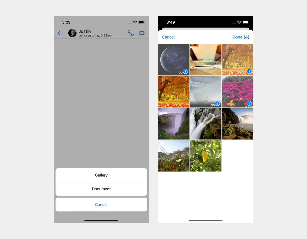 You can send the image & Video by clicking the attachments icon in the Chat screen of the user whom you are chatting with. On selecting the Gallery from the Actionsheet menu, you can select the images & video from the phone gallery.